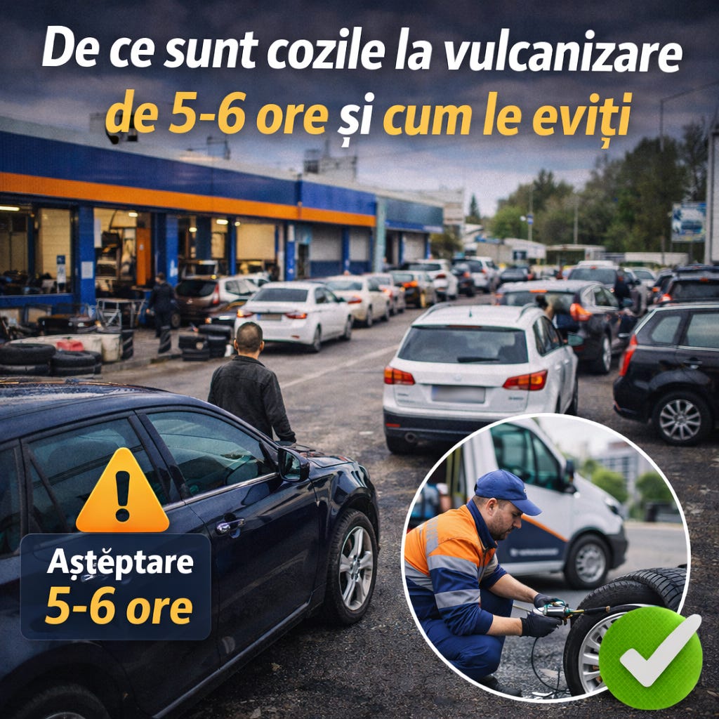 Dacă ai trăit toamna asta (sau primăvara trecută) experiența de a sta la coadă la vulcanizare, știi despre ce vorbim. Dai 2 numere de telefon, niciunul nu răspunde. Ajungi la service la 9 dimineața și ți se spune “poate pe la 14:00”. Revii la 14:30 și mașina nu e gata.