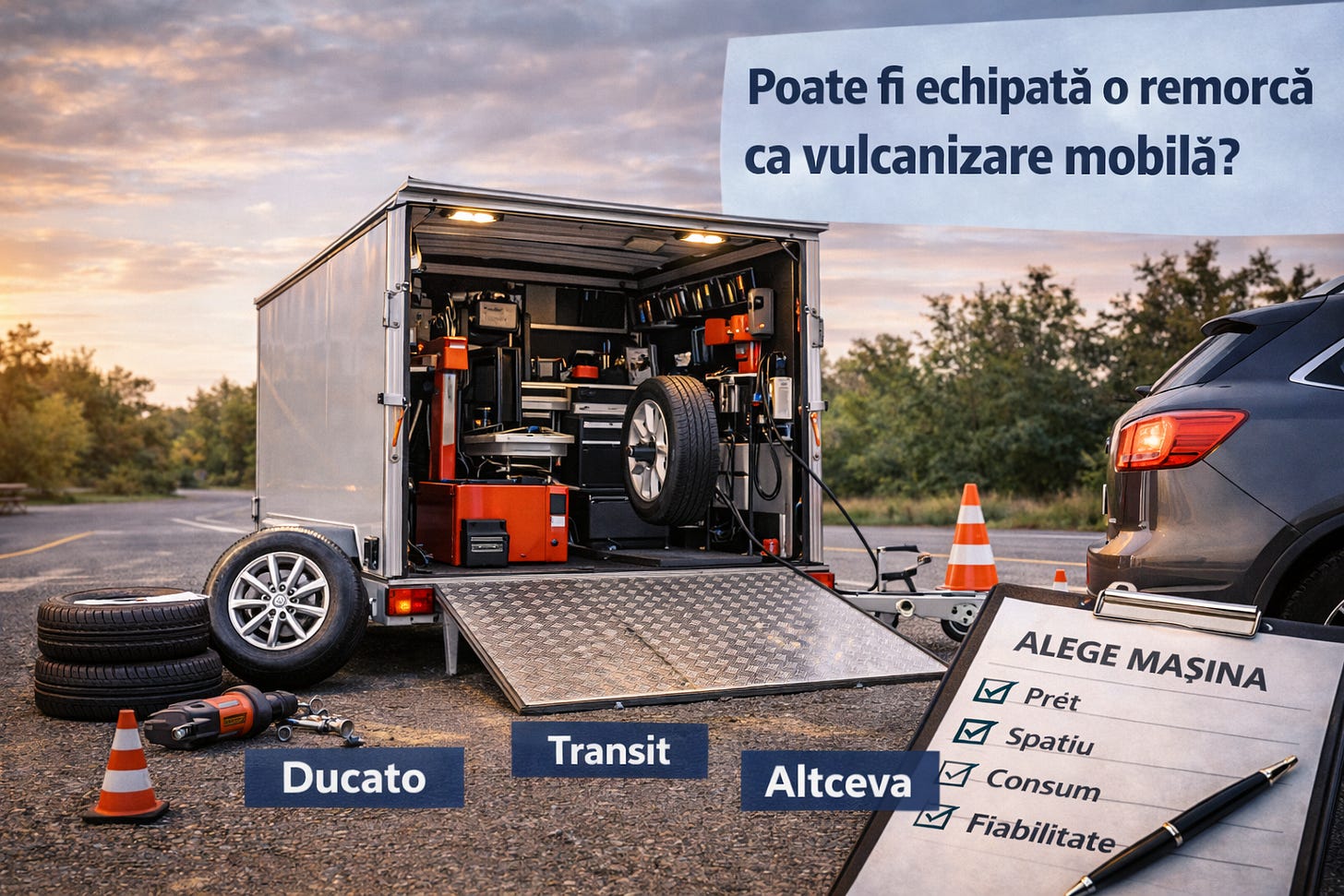 Remorca echipată ca atelier mobil are sens pentru activitate industrială/B2B sau ca extensie a unui service fix. Nu e prima alegere pentru un vulcanizor care deservește clienți B2C în orașe. Dacă ești în scenariul industrial, merită discutat cu RAR din județ specificul omologării înainte de orice investiție.